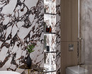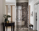 В прихожей и кухне-гостиной на стены поклеили натуральные шелковые обои. Чтобы защитить поверхности от грязи, их покрыли специальной грязеотталкивающей пропиткой. Стена с дверью в ванную комнату оформлена зеркалами. Это помогло визуально увеличить пространство и сделать прихожую по-настоящему парадным помещением. Той же цели — визуальное увеличение, парадность — служат высокие гипсовые карнизы, которые «заходят» на потолок и помогают визуально его увеличить. В отделке также использовали молдинги и состаренные вручную зеркала.
