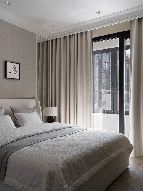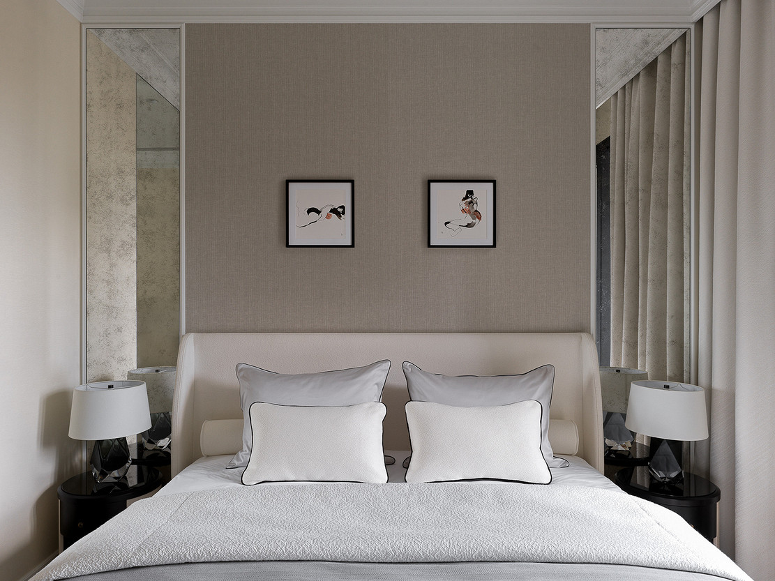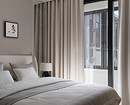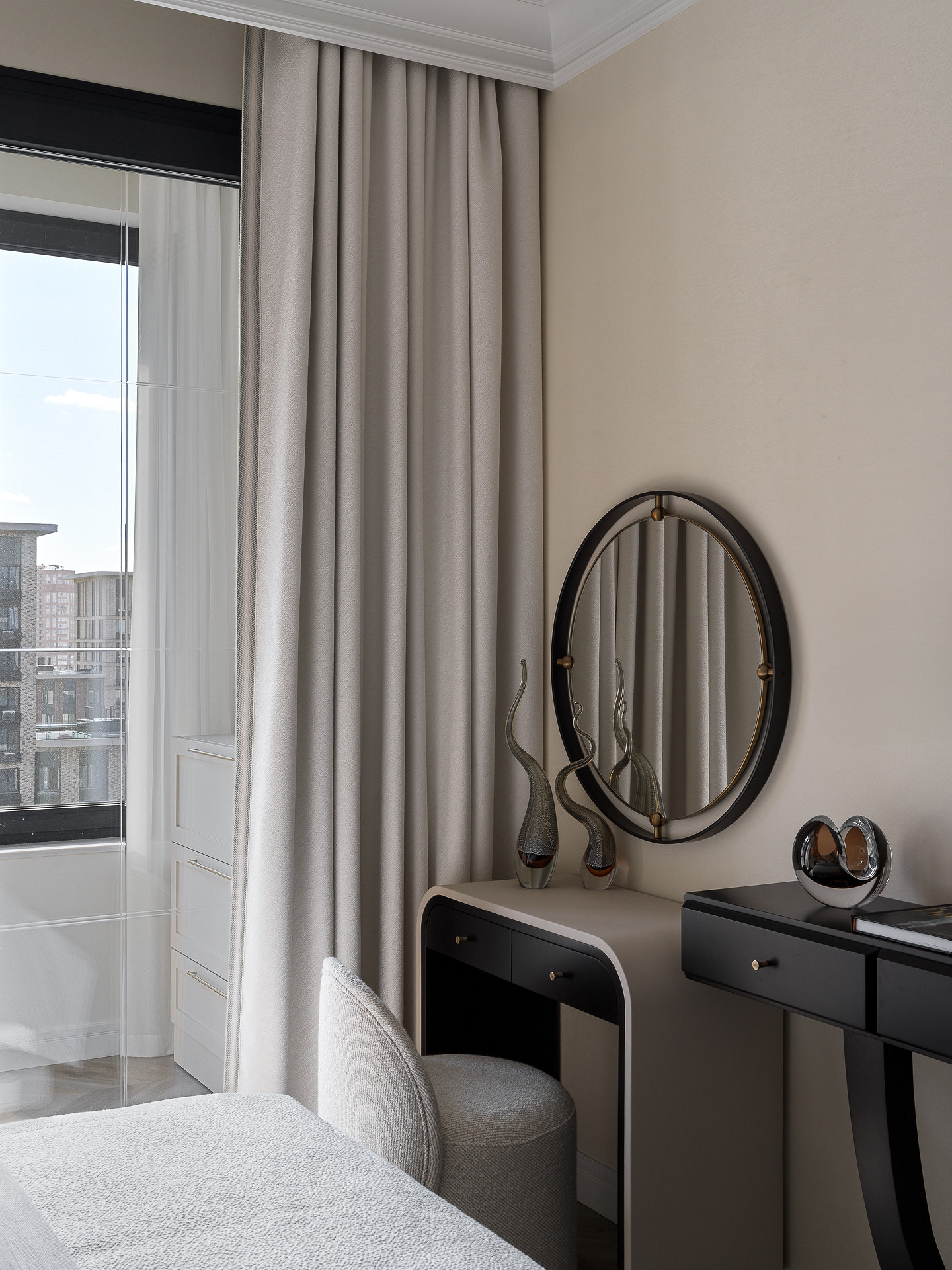 Особенность проектирования света — отсутствие выключателя снаружи ванной комнаты. Он расположен внутри, а мягкие подсветки включаются по датчику движения при открытии двери. Такое решение приняли, чтобы не создавать визуальную «заплатку» на зеркальной стене. Датчик движения включает свет и в гардеробной. В прихожей предусмотрен мастер-выключатель для того, чтобы выключить сразу несколько групп освещения. В спальне выключатели с управлением всеми источниками света находятся у изголовья кровати, как и блок управления электрокарнизом на шторах.