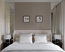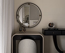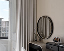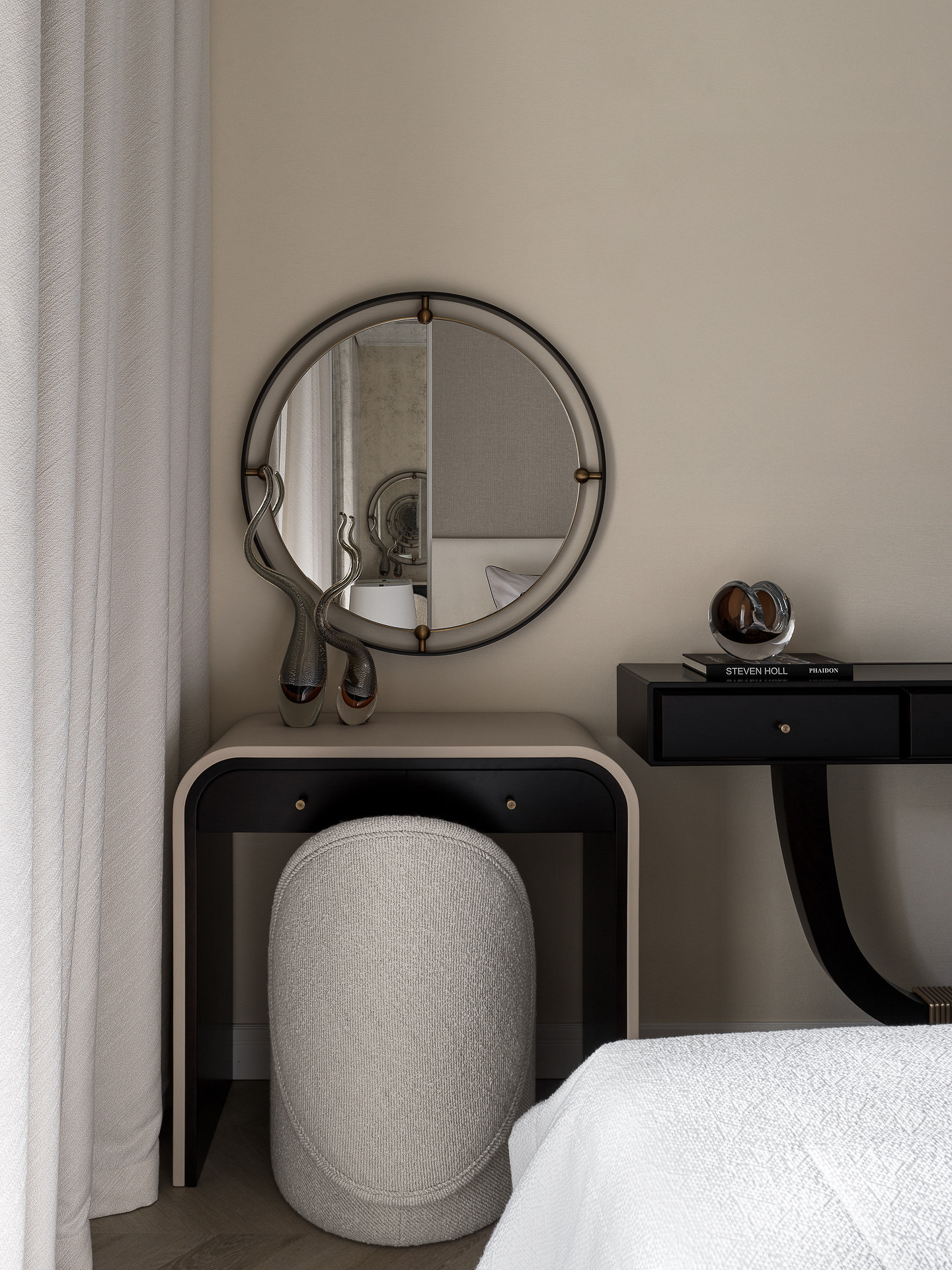 В спальне основное место занимает двуспальная кровать. Также уместили консоль и туалетный столик.