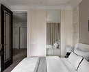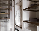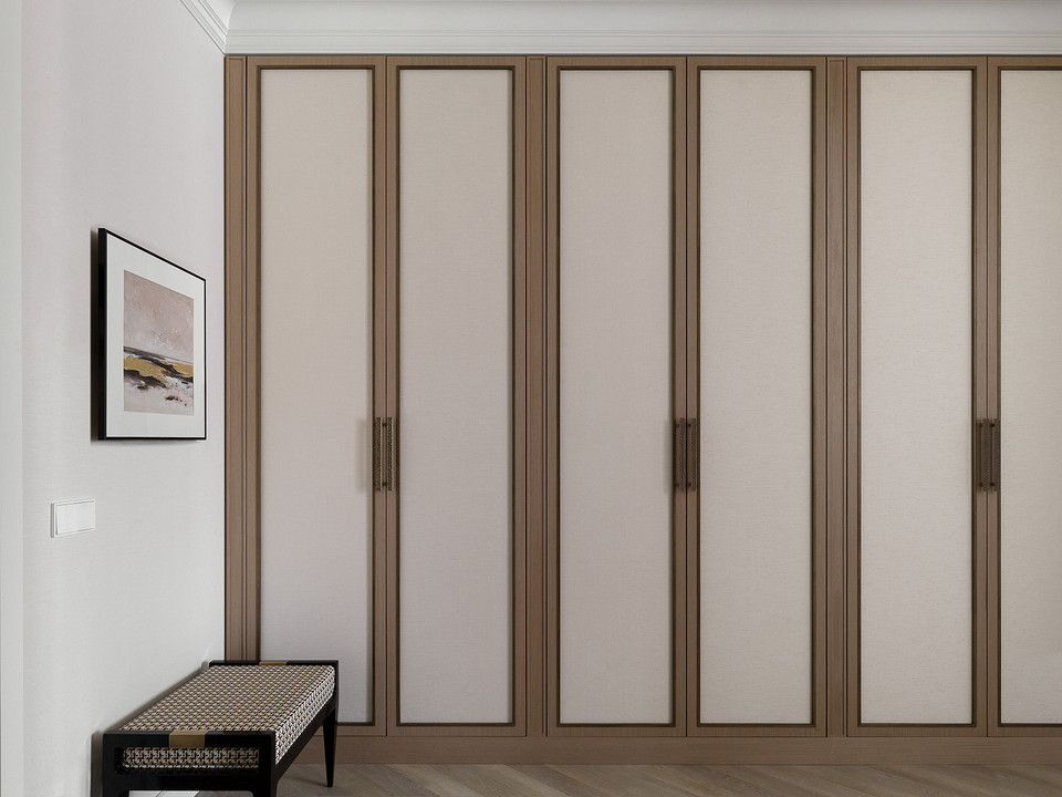 Дверь в гардеробную в этой комнате — скрытого монтажа и полностью отделана зеркалом. Стены гардеробной также оформлены льняными обоями, как и задние стенки открытых секций.
