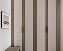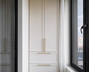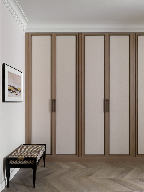 За счет расширения прихожей удалось разместить там вместительный шкаф на шесть секций. У каждой — свое назначение. Первая — неглубокая секция, всего 20 см, там спрятаны электрощитки. Вторая секция — для хозяйственного хранения: мелкой бытовой техники, гладильной доски, вертикального пылесоса с зарядкой. Третья — полки, в четвертой — место для хранения обуви. В двух последних секциях — вешалки для верхней одежды и выдвижные ящики для мелочей. Фасады шкафа отделаны шпоном дуба и обоями из натурального шелка, а ручки выполнены из латуни с чеканкой.