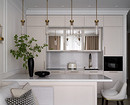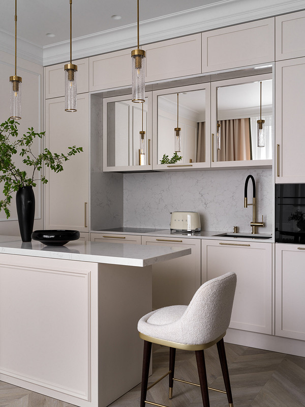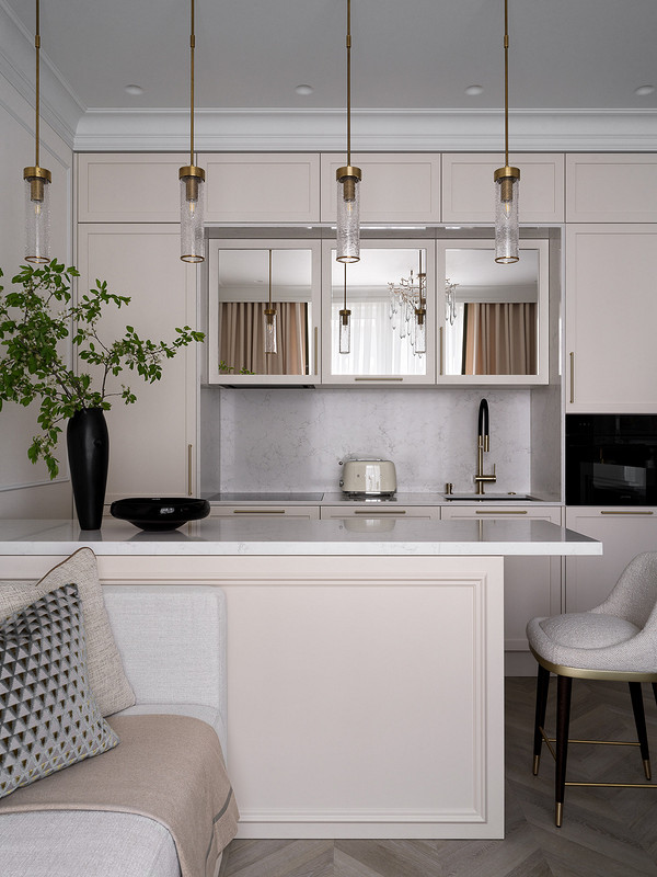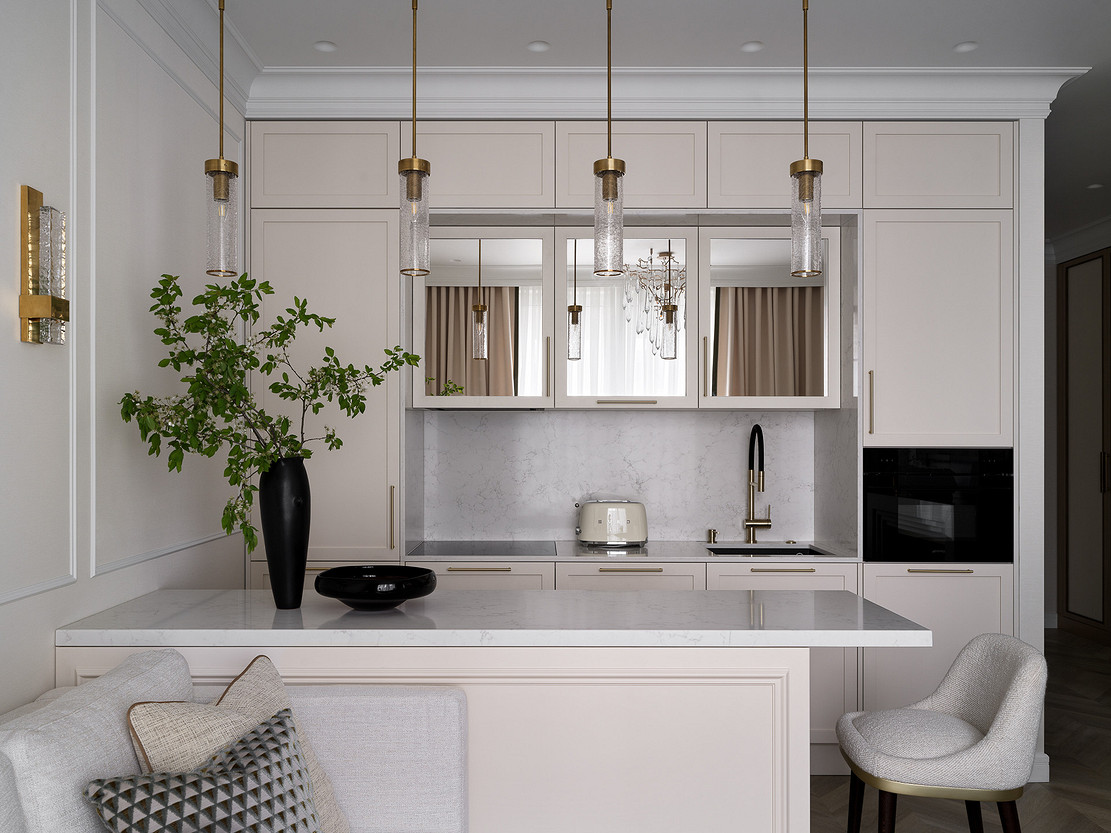 Кухонный гарнитур выстроен в линию со шкафами-колоннами по обеим сторонам: в колонне слева спрятан холодильник, справа — духовой шкаф с функцией СВЧ и встроенная стиральная машина с функцией сушки. Верхние шкафы — с зеркальными фасадами, а для дополнительного хранения предусмотрены антресольные шкафы.