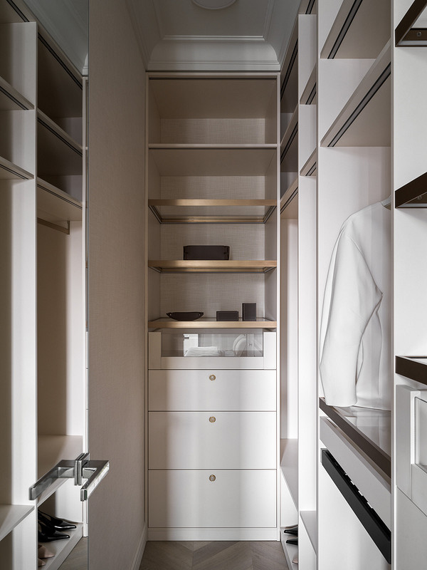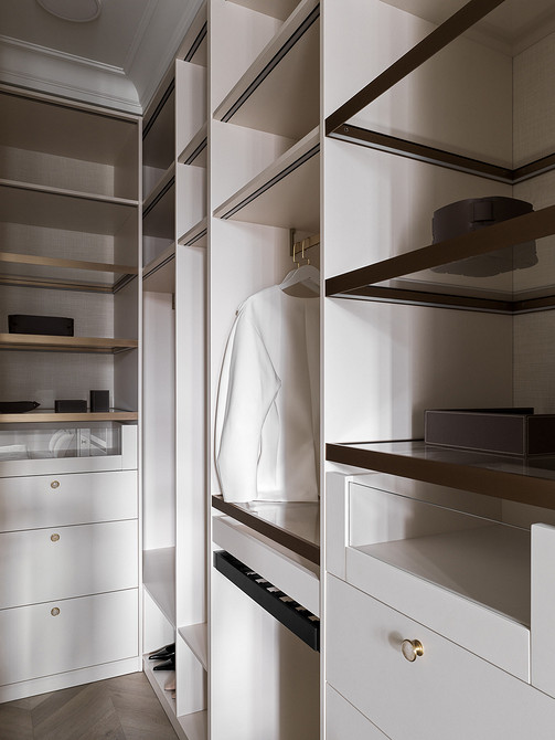В спальне — отдельная гардеробная, где продумано хранение разных вещей: на полках, в выдвижных ящиках, на вешалках. Для визуальной легкости часть полок выполнена из стекла.