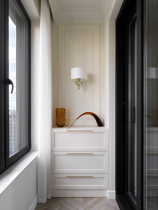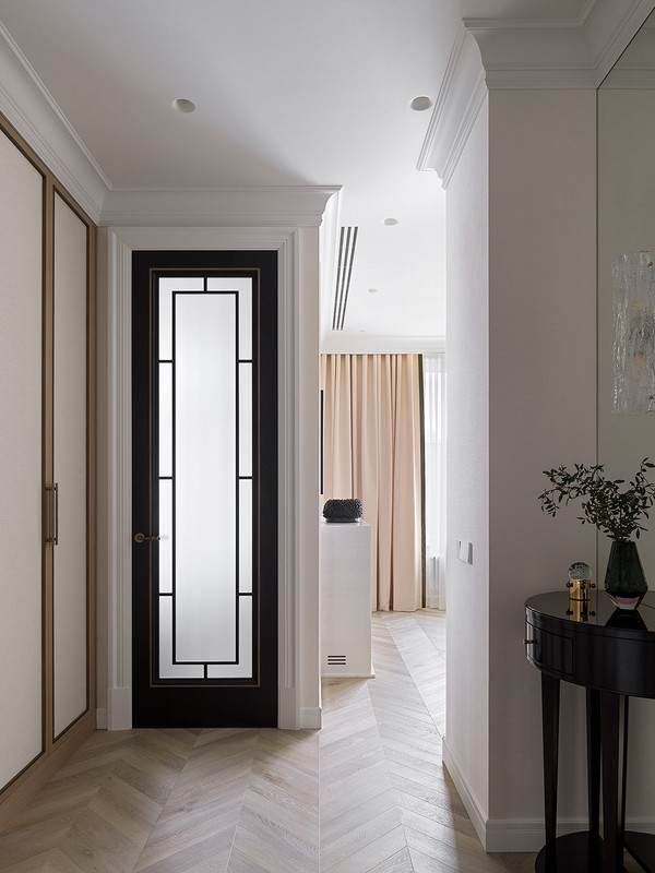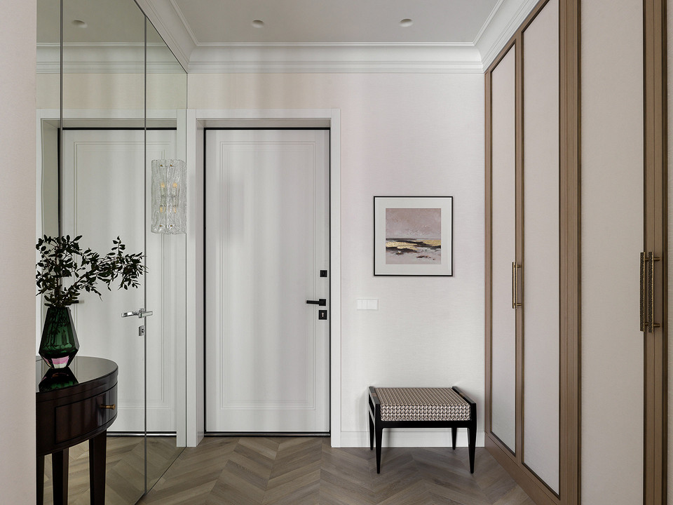«Входную дверь от застройщика мы оставили, но заменили внутреннюю накладку, оформив ее в нашей стилистике. Цвет краски для дверной накладки, потолка, карнизов, плинтусов и молдингов заколерован в одном оттенке, тем самым все эти элементы «подружились» между собой и считываются целостно», — рассказывает автор проекта, дизайнер Любовь Сядро.