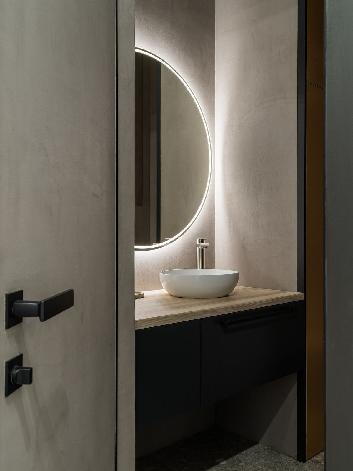 Натяжной потолок сделан с теневым профилем. Плинтус — тоже теневой. Дверь в санузел — скрытого монтажа, на фоне стены она практически незаметна. Все это признаки современного минималистичного интерьера. А фактуры — микроцемент, кварцвинил под дерево, керамогранит — «разбавляют» монотонность минимализма.
