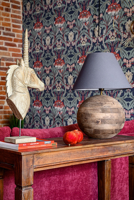Открытый кирпич стал главной изюминкой отделки. По догадкам автора проекта, кирпич в гостиной-столовой может быть середины XIX века, на кухне и в ванной комнате — более поздний — конца XIX в. Часть кирпичной кладки оставили и в спальне. Большая стена в гостиной оклеена яркими обоями с рисунком в стиле Уильяма Морриса, ниши окрашены.