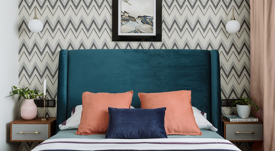 В спальне родителей особое внимание уделили созданию приятного визуально-тактильного многообразия. Стену за высоким изголовьем кровати оклеили обоями, а шторы пошили на заказ из рогожки, бархата и хлопка.