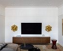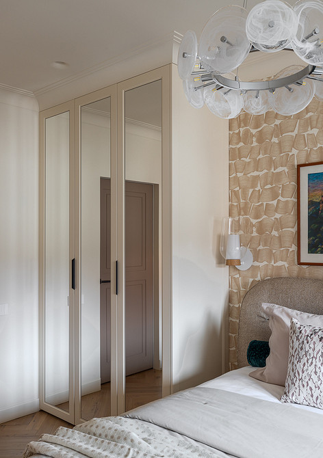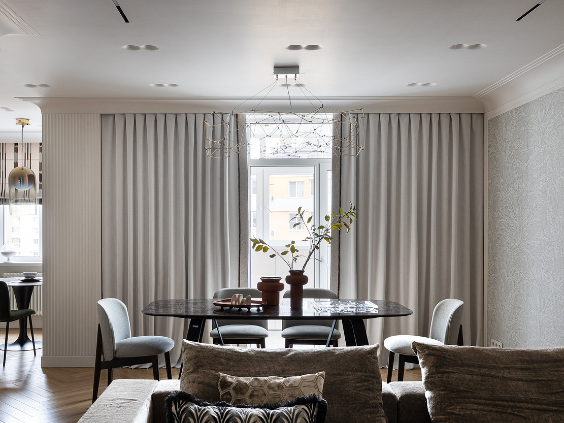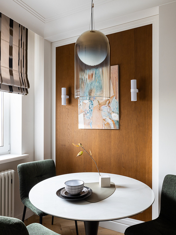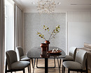 Квартира расположена на теневой стороне, поэтому задачей дизайнера было сделать ее светлее и с помощью искусственного света. Продумали разные сценарии света. На потолке — точечные и линейные встроенные светильники, кроме этого есть люстры над обеденным столом, в прихожей, спальнях. Предусмотрены настенные бра в спальнях у кроватей, у зеркал, картин в прихожей и на кухне. Над обеденным столом на кухне разместили подвес, напоминающий луну.