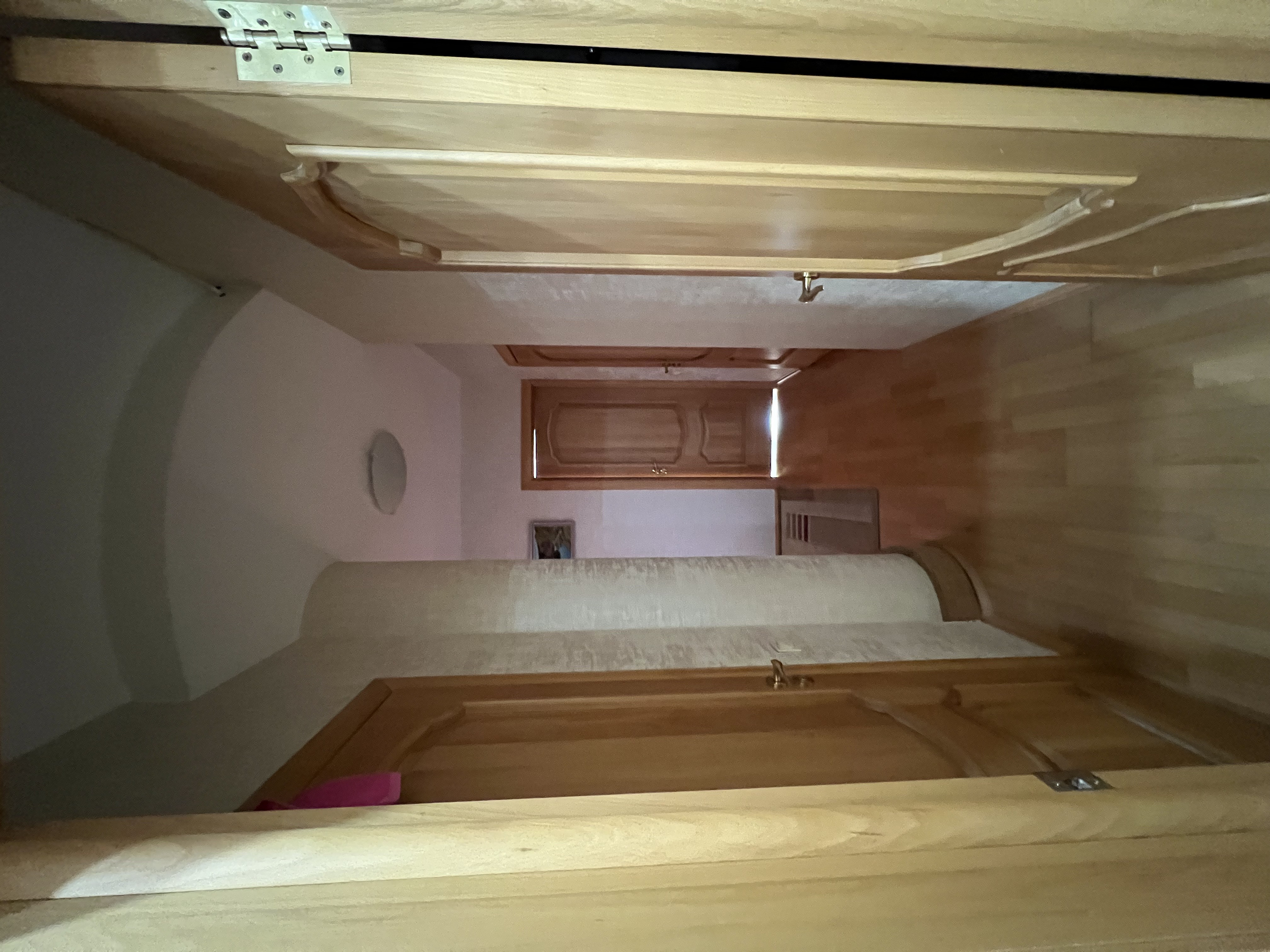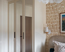 В спальне хозяев шкаф встроили в стену рядом с дверью. Это вместительная система хранения на четыре секции.