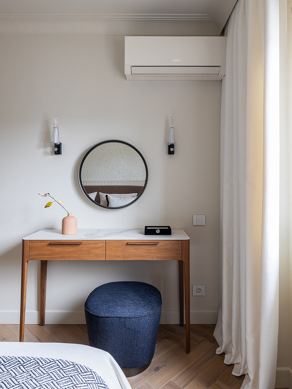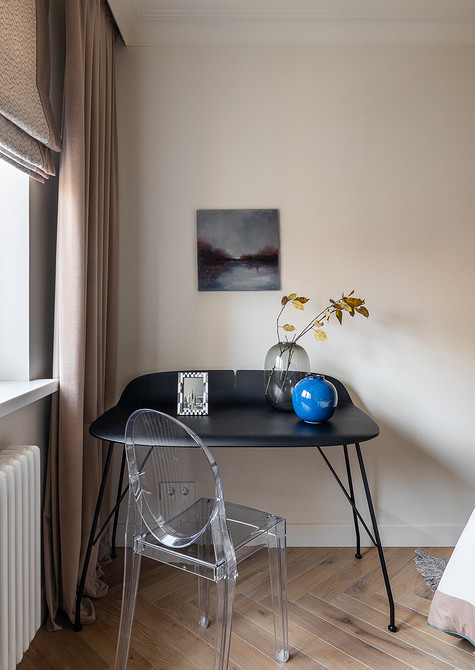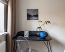 Напротив кровати поставили стол, который может выполнить роль и туалетного, и рабочего.