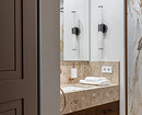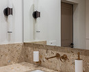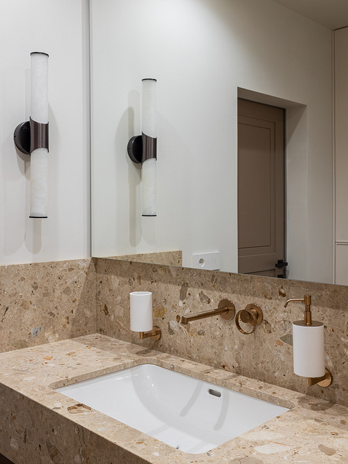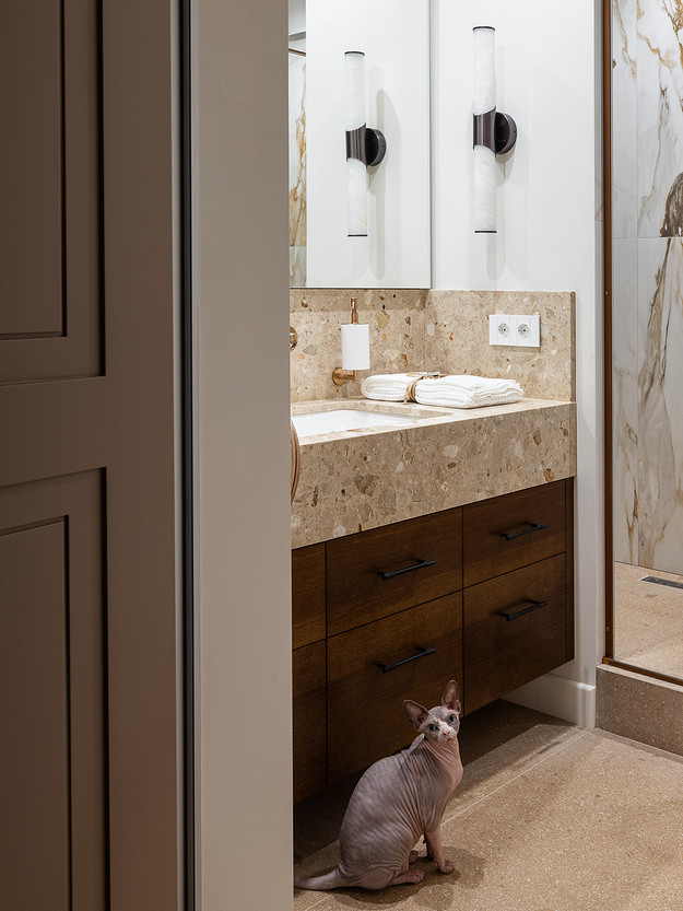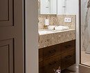 В ванной комнате уложили керамогранит теплого коричневого оттенка на пол и стену с инсталляцией, а на стены душевой — керамогранит под мрамор с коричневыми прожилками. Столешницу тумбы под раковину выполнили из камня, как и «фартук» на стенах вокруг раковины.