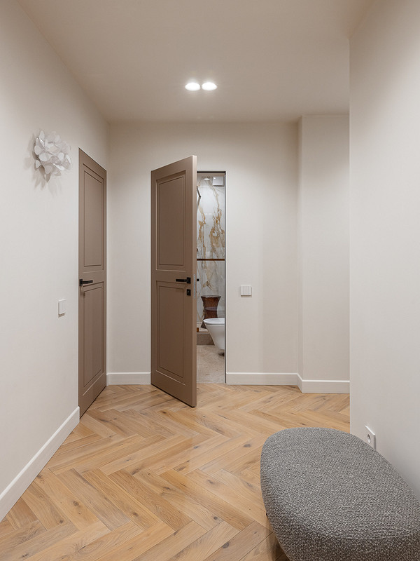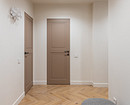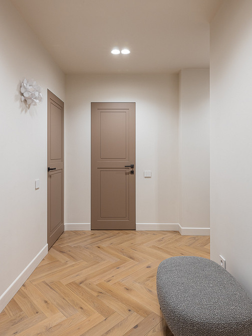 На пол уложили инженерную доску цвета светлого дерева, уложенную «елочкой». Для прихожей выбрали светлый керамогранит с темными вставками.