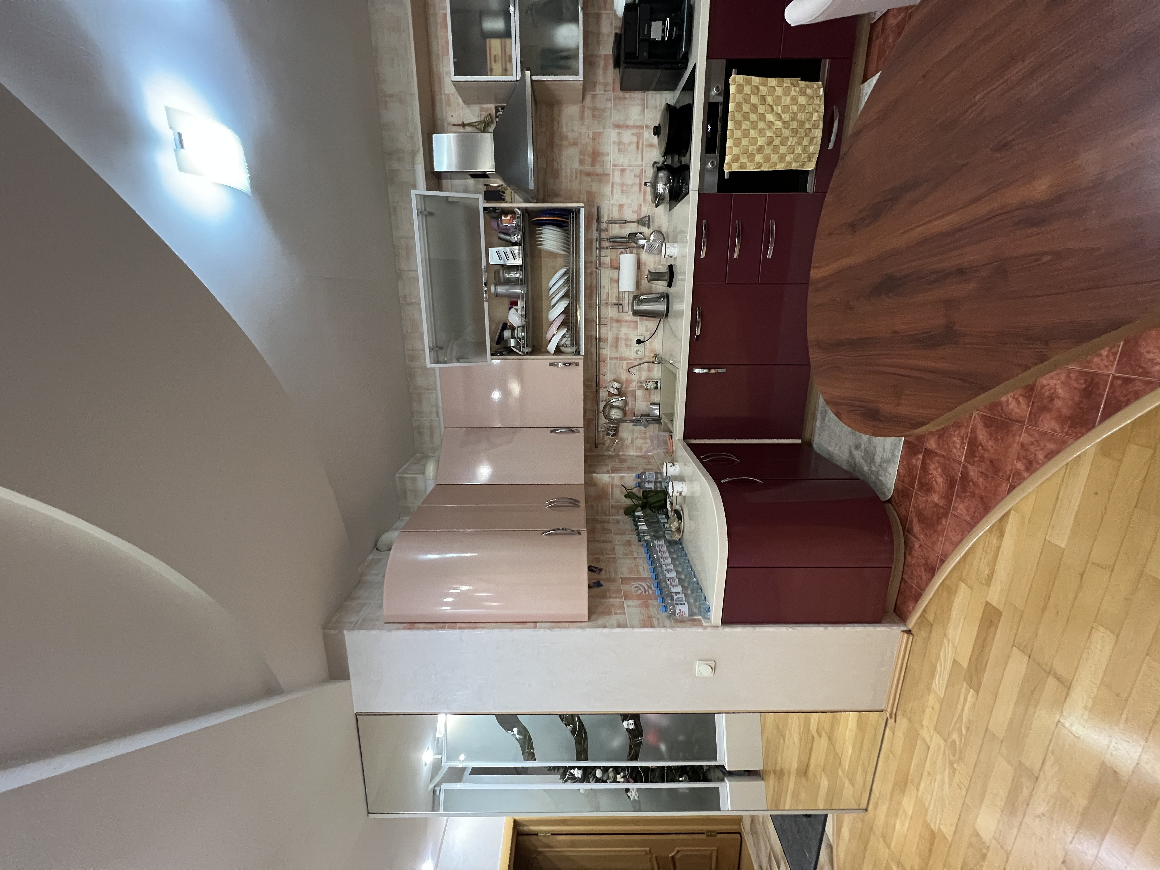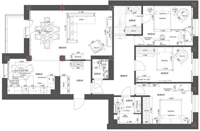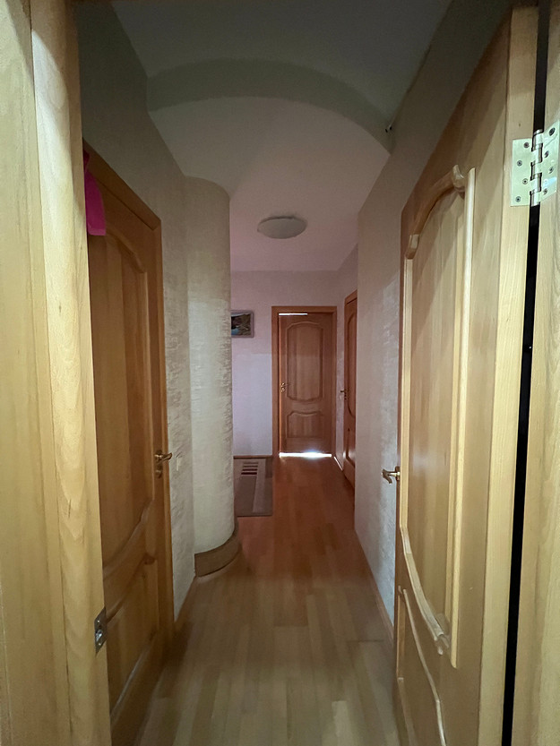 Квартира двухуровневая, но переделывали только первый этаж: кухню-гостиную, три спальни, связанных длинным коридором, ванную комнату и туалет. Изначальную планировку незначительно поменяли: отделили прихожую от кухни-гостиной перегородкой, расширили дверные проемы в коридор и одну из комнат, выделили гардеробную комнату в одной из комнат, предназначенных для дочерей. Подоконный блок между лоджией и гостиной заменили на остекление в пол.