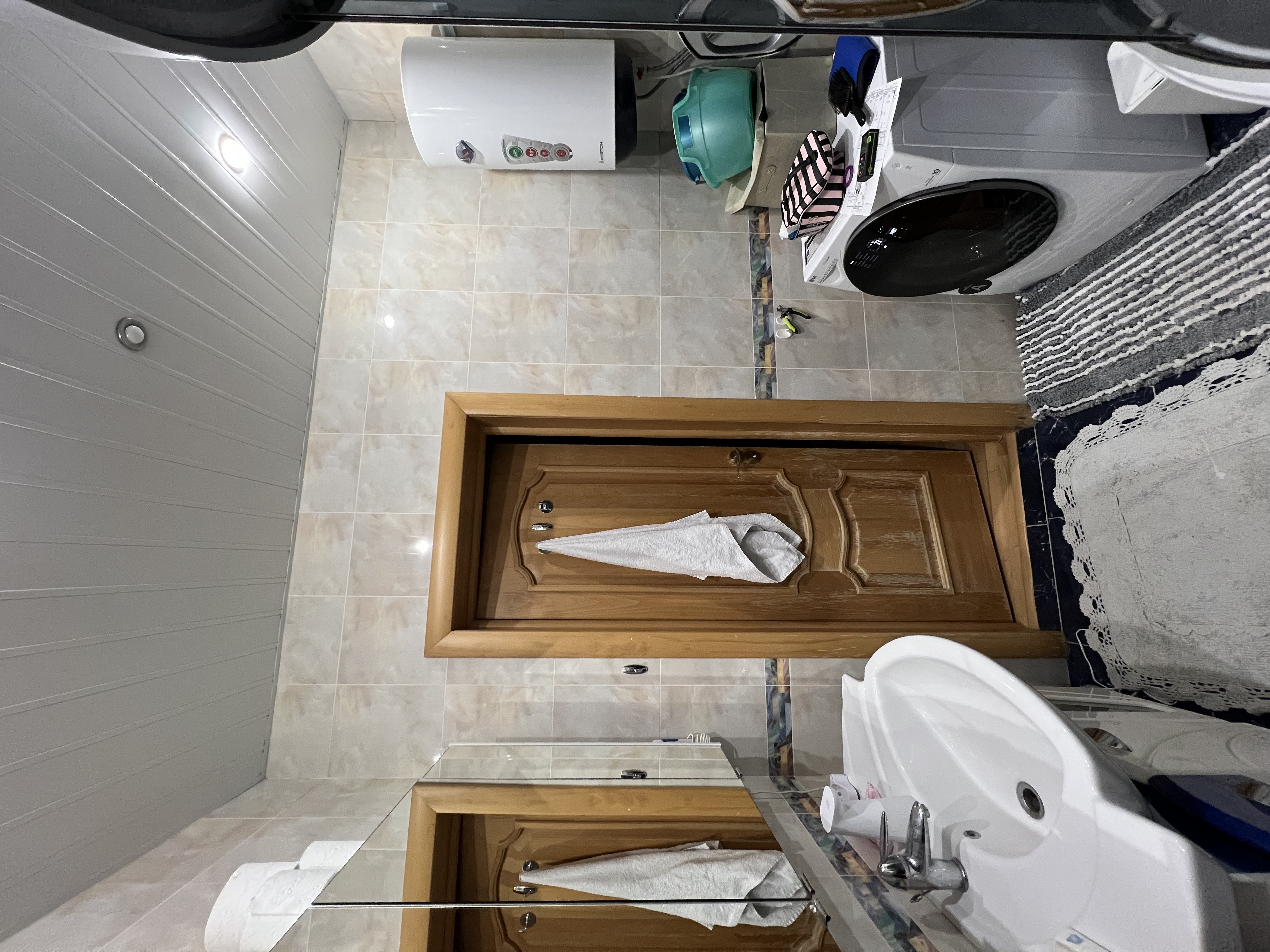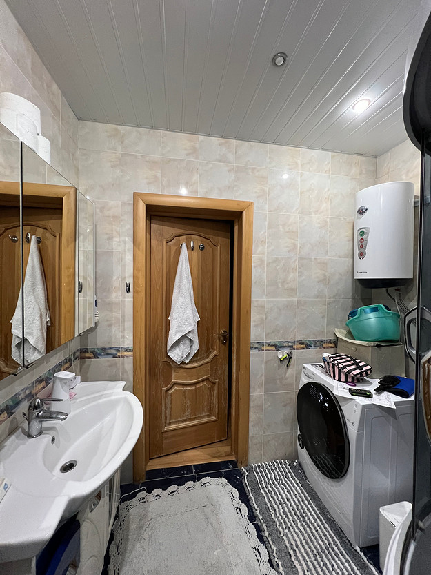 В ванной комнате — тумба под раковину, установленная под каменную столешницу, а также хранение над инсталляцией унитаза. В туалете организовали постирочный блок: стиральная и сушильная машина.