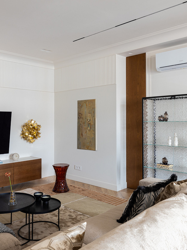 Владельцы квартиры — семья с двумя взрослыми дочерьми, которые уже не живут с родителями, но часто приезжают в гости. Семейная пара не в первый раз обращается к дизайнеру Регине Бикбулатовой. «Главным запросом было избавиться от скругленных многоуровневых потолков, вычурных углов и узких переходов. Убрать многочисленные рельефы из гипсокартона на стенах, впустить как можно больше света в квартиру, а также поменять всю мебель», — рассказывает о своих задачах дизайнер.