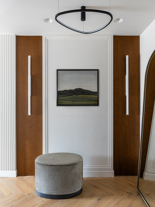 Системы хранения продумали так, чтобы сделать их незаметными в интерьере. В прихожей встроили шкаф для верхней одежды и обуви. Рифленые фасады повторяют рельеф панелей в гостиной.