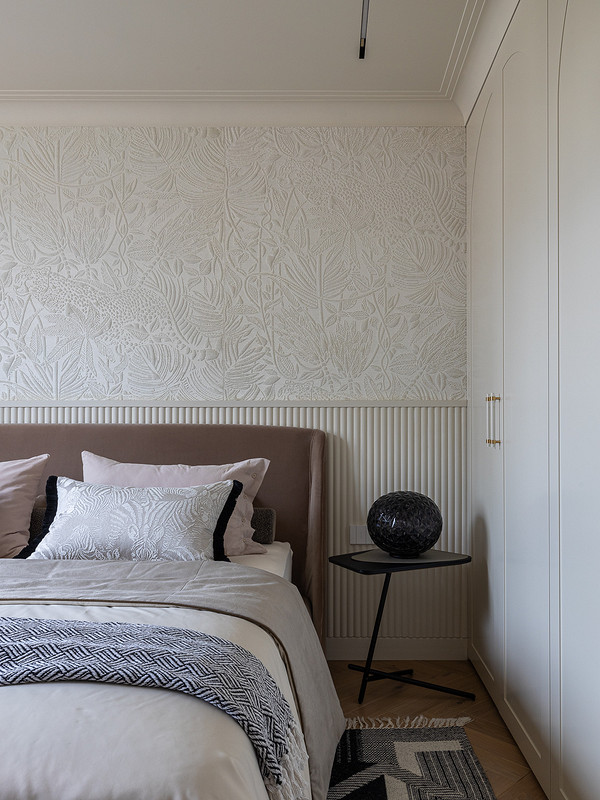 Основная отделка стен — краска. Для того чтобы разнообразить гладкие однотонные стены, использовали панели: на кухне панели из дерева, в гостиной и спальне — рельефные панели в виде реек, окрашенных в цвет стен. Также дизайнер применила для акцента обои: их поклеили в столовой зоне, в родительской спальне за изголовьем кровати и в гостевой комнате. Благодаря демонтажу многоуровневых потолков их высота в новом интерьере увеличилась на 10 см. Высоту подчеркнули высокими карнизами.