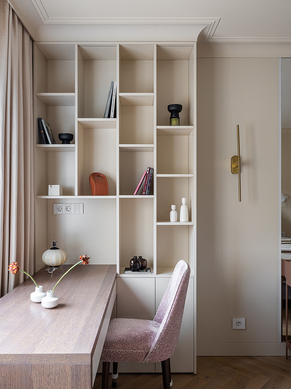 Также для одной из дочек предусмотрено рабочее место со стеллажом с открытыми полками, во второй комнате стоит маленький туалетный столик.