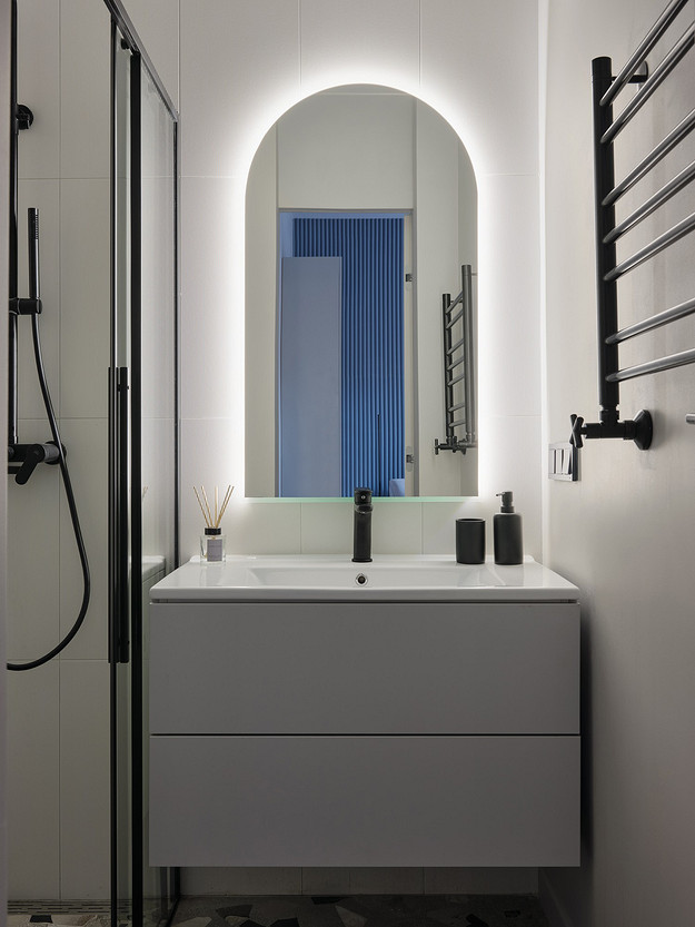 Серый цвет стен в ванной аналогичен цвету в спальне. Стены частично покрыты краской, частично — плиткой. Зеркало в форме арки — дань петербургским традициям декора.