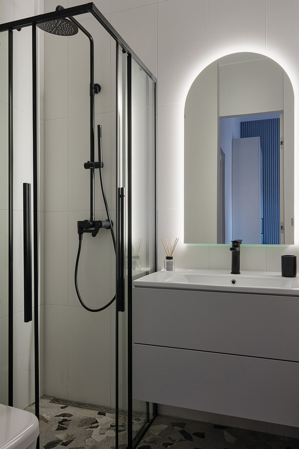 В ванной комнате серый добавили в окантовку по периметру стен, что позволило объединить все помещения в единую историю. Необычный прием — две душевые лейки, чтобы принимать душ вдвоем.