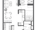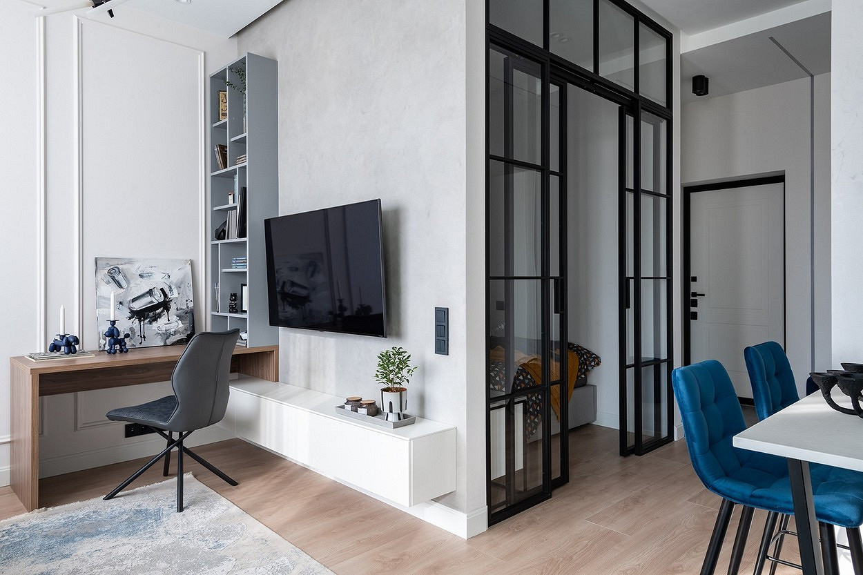 Дизайнер предлагала около 15 вариантов планировки, но в той, что получилась в итоге, решила выделить маленькую (около 5 квадратных метров) спальню в нише со стеклянной перегородкой, а кухню объединить с гостиной. Так получилось общее пространство для молодого человека, который любит принимать гостей.