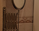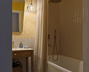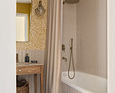 В ванной комнате использовали обои с рисунком на стене над раковиной (том участке, куда не должна попасть вода). «Это роскошные обои с листьями от английского бренда. Было необходимо сделать интересный акцент, но площадь была небольшой, что позволило использовать дорогую отделку», — комментируют дизайнеры.