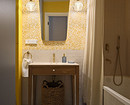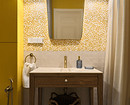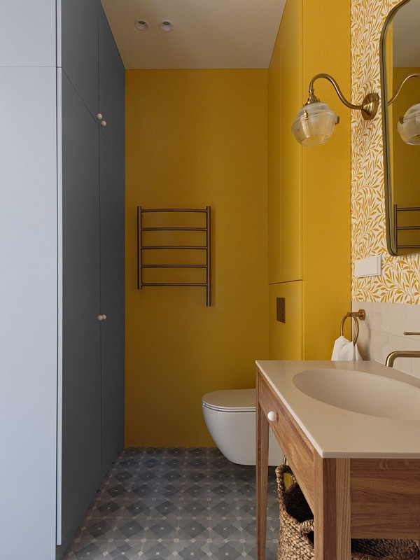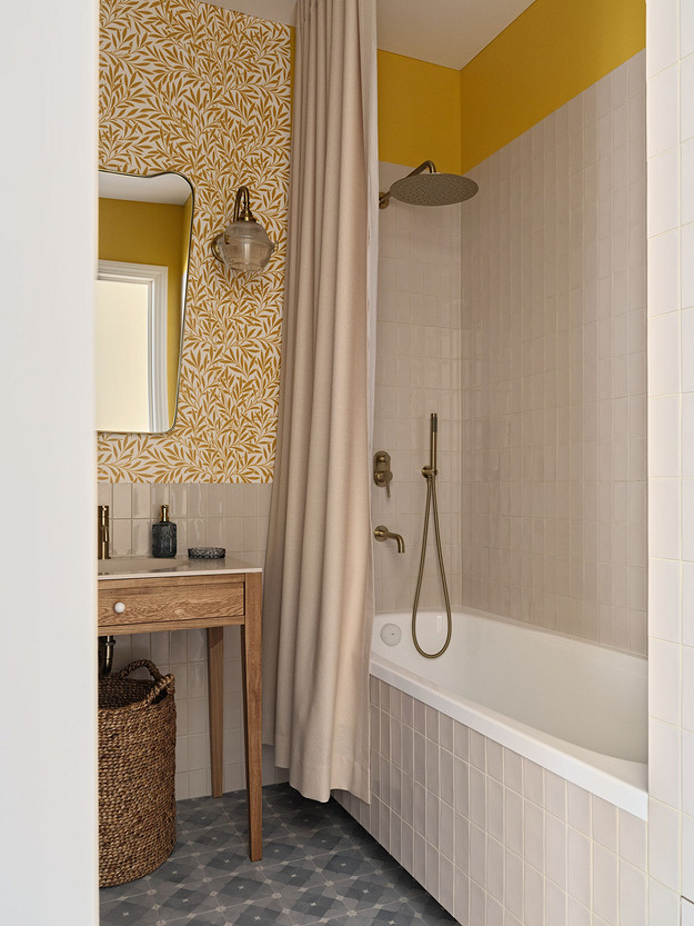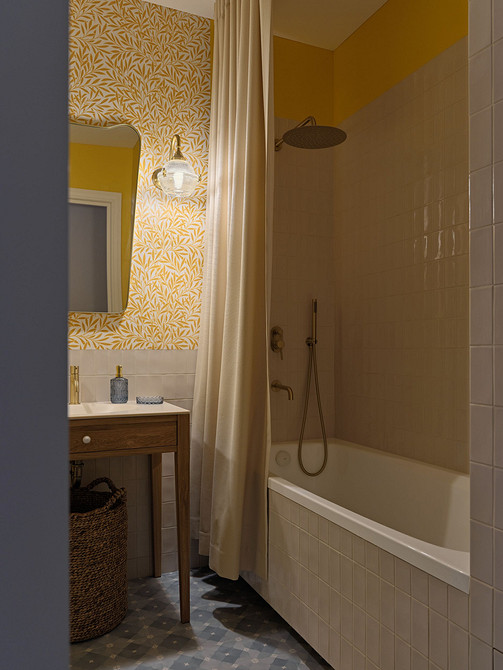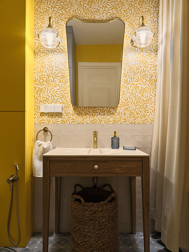 Обои в ванной комнате скомбинировали с мелкоформатной плиткой бежевого цвета, которую уложили в зоне ванны и над раковиной. Остальные стены покрасили желтой краской. На пол уложили серо-голубую плитку с ритмичным рисунком.
