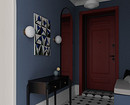 В прихожей отказались от шкафа, так как там есть вход в хозяйственный блок с системой хранения, где можно повесить верхнюю одежду. Там же организовано и место для хозяйственного хранения. У входной двери поставили банкетку с местом для хранения обуви, а также консоль для мелочей.