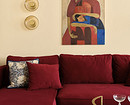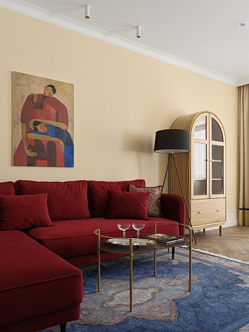 В гостиной поставили красивый буфет арочной формы (арки встречаются в разных комнатах по всей квартире, это и зеркало в прихожей, и дверной проем на кухню, а также ниша шкафа в спальне), напротив дивана в насыщенной бордовой обивке — тумба под телевизор.