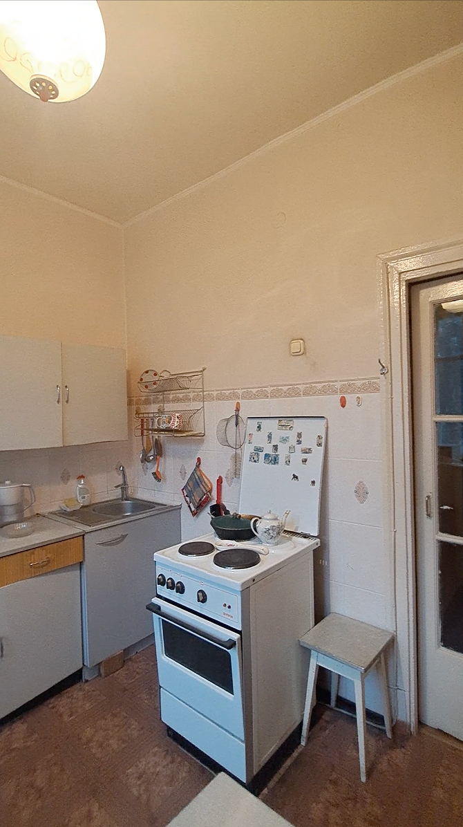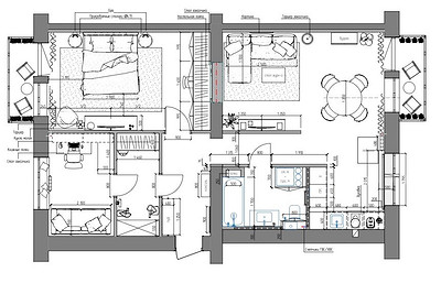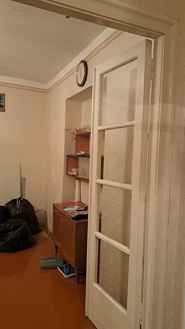 Изначальную планировку — три комнаты с небольшой кухней, раздельными ванной и туалетом, двумя балконами — изменили в соответствии с потребностями хозяев. Кухню объединили с комнатой, организовав просторную кухню-гостиную. Ванную и туалет объединили и увеличили за счет коридора. Одну из комнат разделили: сделали проходную кладовую и изолированный кабинет у окна.