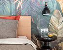 В изголовье кровати на антресоли решили сделать акцент в виде фрески с рисунком тропиков — отсылка к экзотическому настроению интерьера.