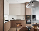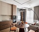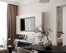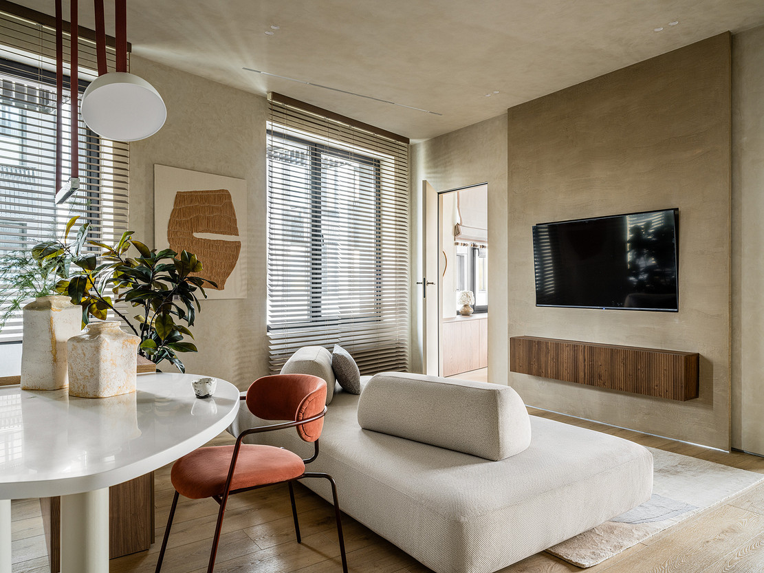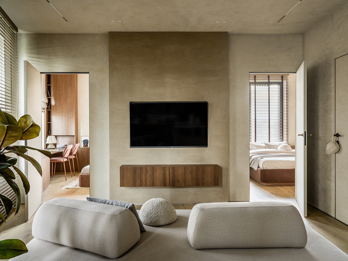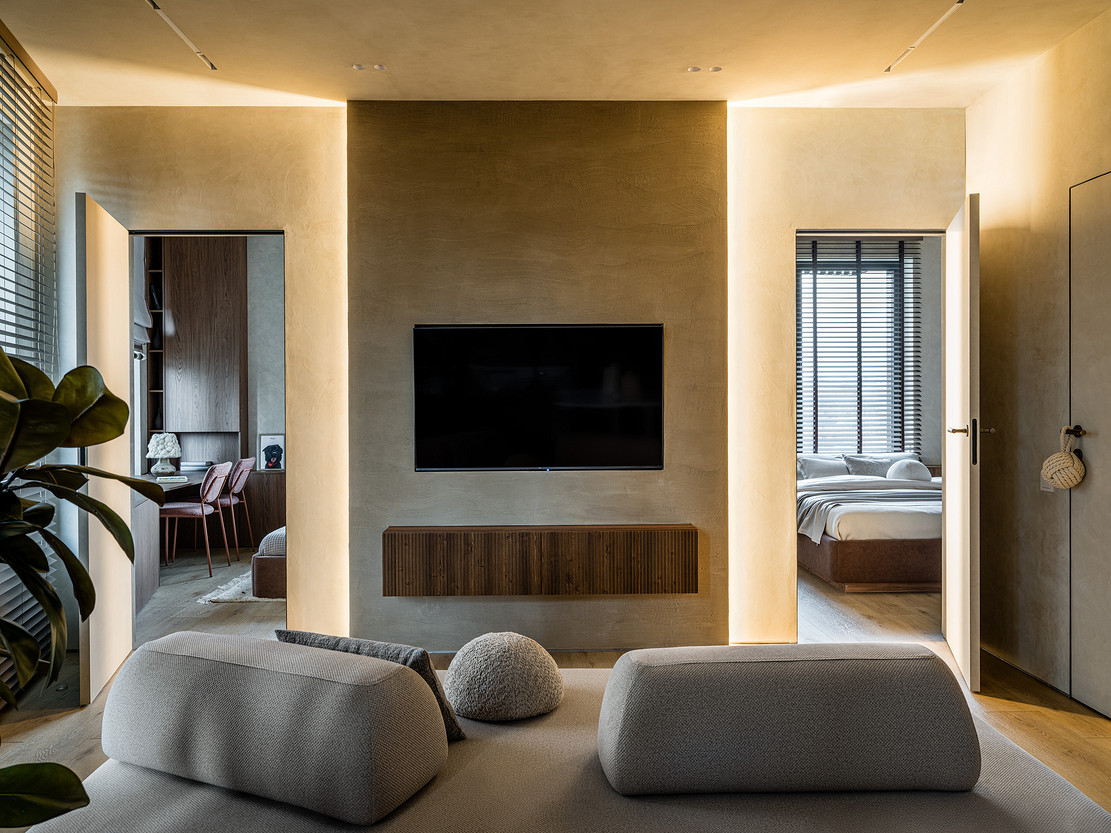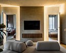 Эта квартира принадлежит молодой семье с двумя детьми и домашними питомцами. Дизайнер Олеся Лещенко создала уютное, расслабляющее пространство в монохромной гамме с акцентом на фактуры. Так, стены и потолок оформлены декоративной штукатуркой нейтрального песочного оттенка, для телевизионной зоны на этапе ремонта сделали выступ, чтобы скрыть все провода, и отделали эту стену штукатуркой на несколько тонов темнее. По бокам монтирована скрытая подсветка, подчеркивающая фактуру стен.