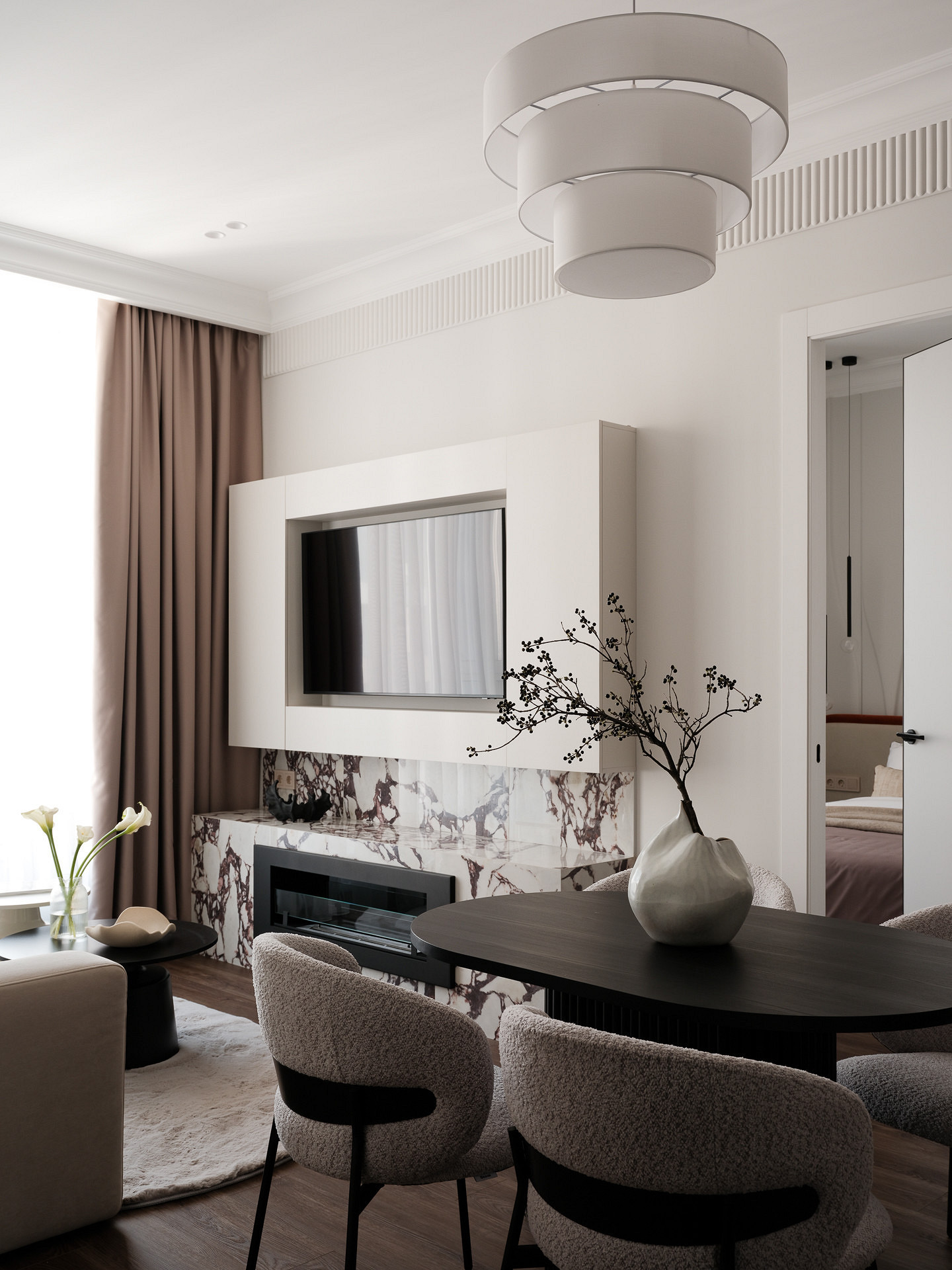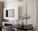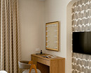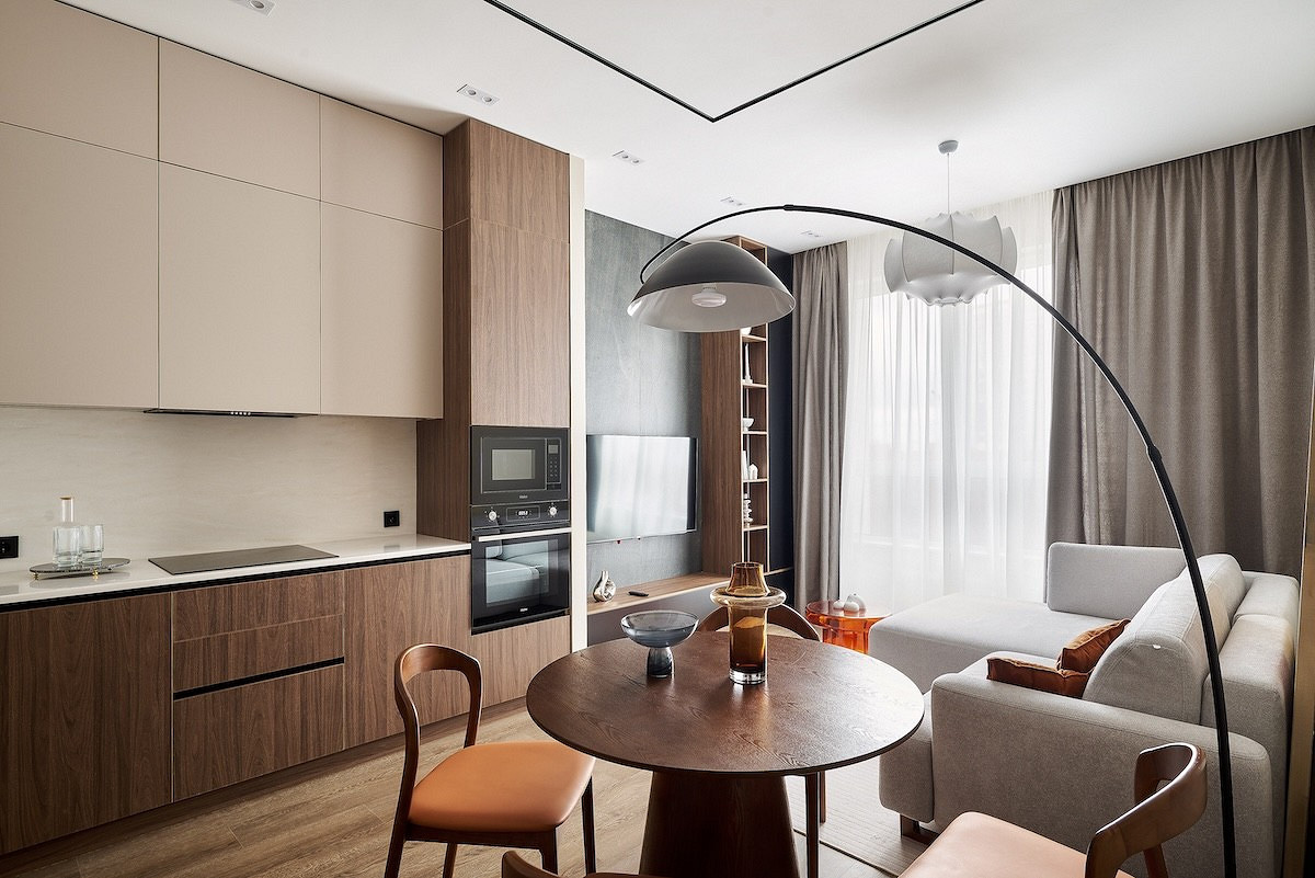 Эта квартира по проекту Евгении Петренко — флиппинг-проект, то есть ремонт сделан для последующей продажи. Интерьер выполнен в современном стиле с акцентами на фактуры и формы. В гостиной телевизор расположен над биокамином и обрамлен шкафчиками в цвет стен. Сам же биокамин и часть стены над ним отделаны красивым керамогранитом с яркой фактурой мрамора, поэтому дополнительные акценты были бы лишними. А шкафчик — нейтральный, но функциональный элемент.