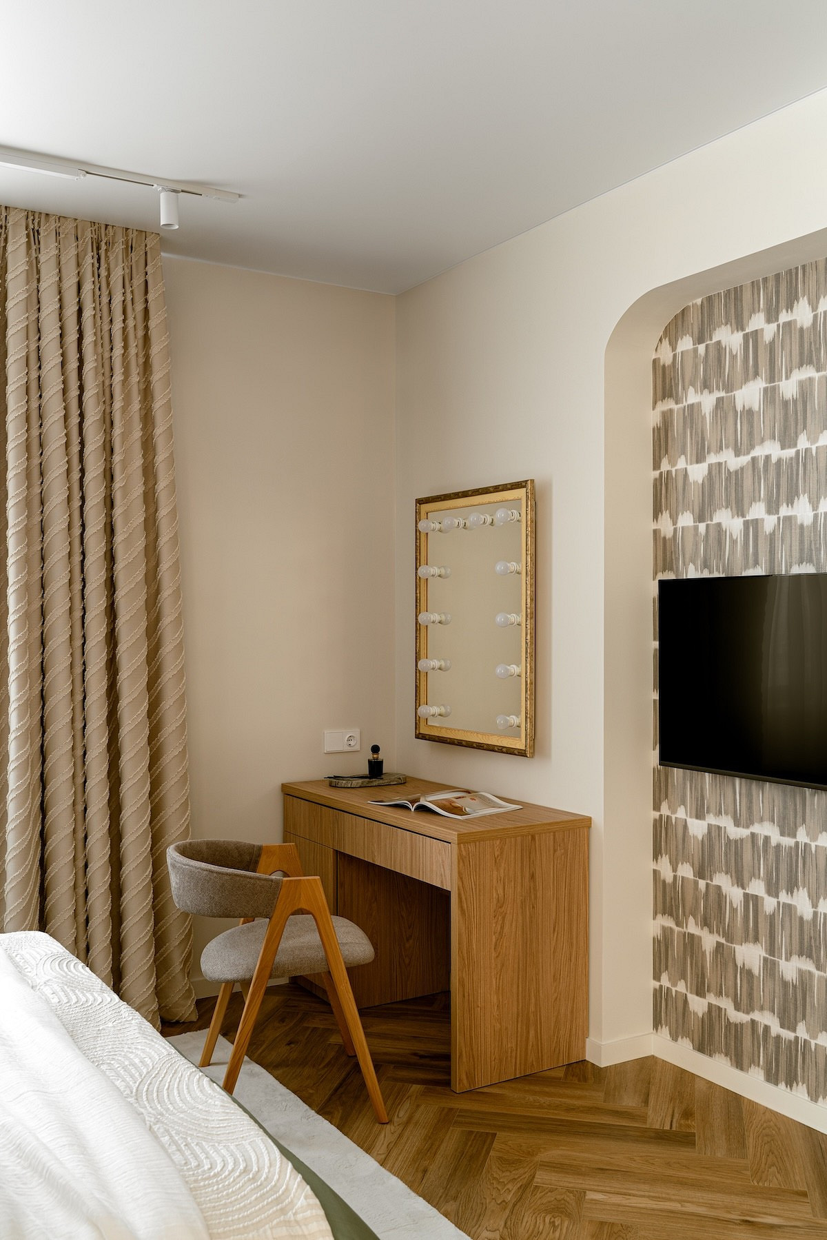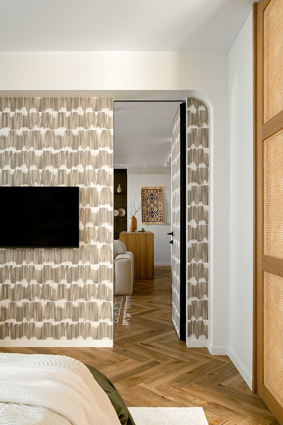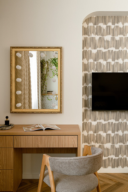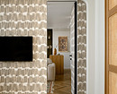 Обычно акцентные обои используют в спальнях и гостиных для стены за диваном или кроватью, но в этой квартире дизайнер Динара Шагапова использовала другой прием. Стена в спальне напротив кровати и дверь скрытого монтажа оформлены обоями с абстрактным рисунком. Цвета обоев не яркие, но по сравнению со светлыми стенами выглядят контрастно. Черный экран телевизора на фоне таких обоев не выглядит «заплаткой», но и рисунок на обоях не будет отвлекать от происходящего на экране.