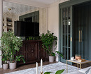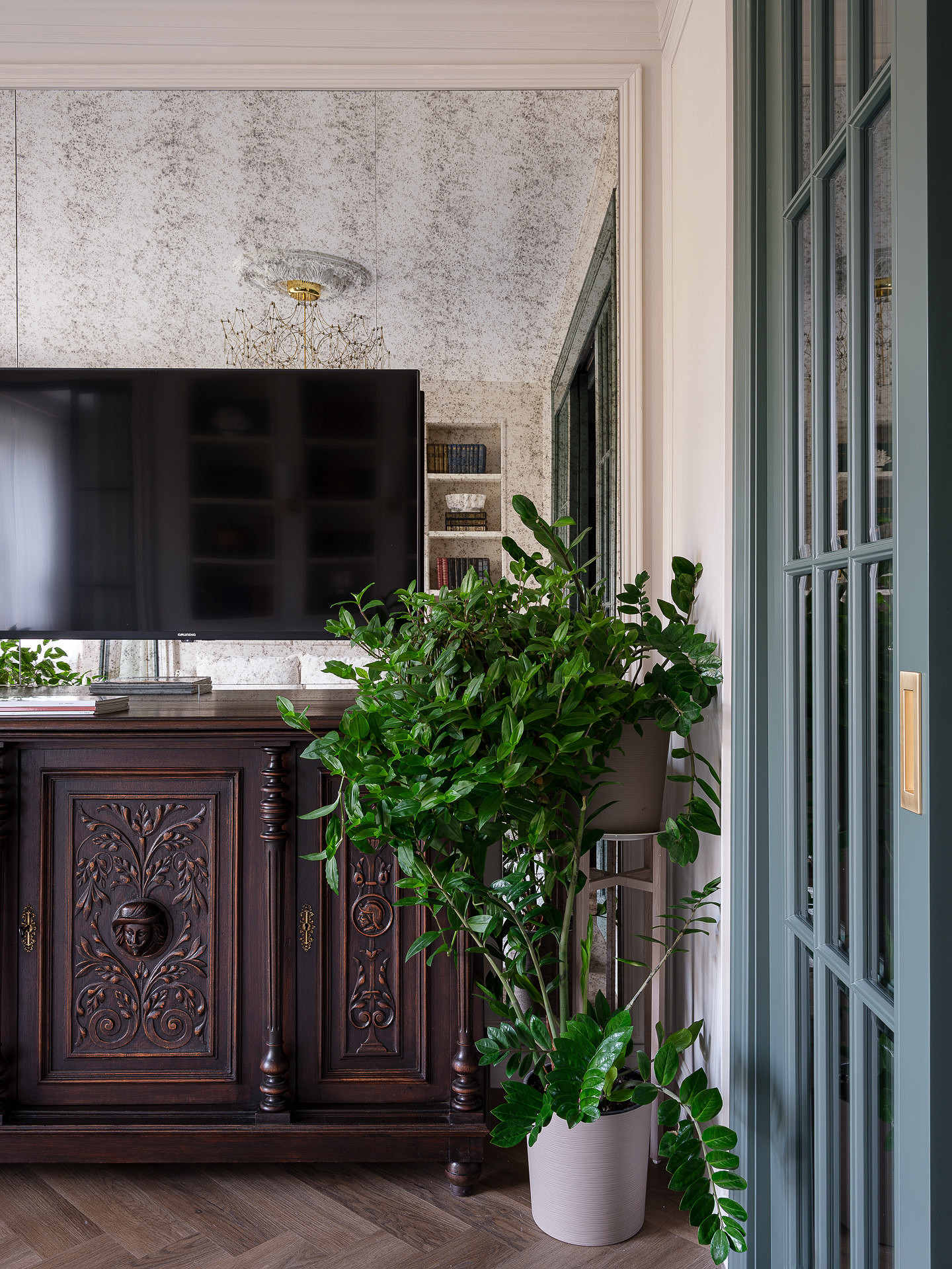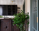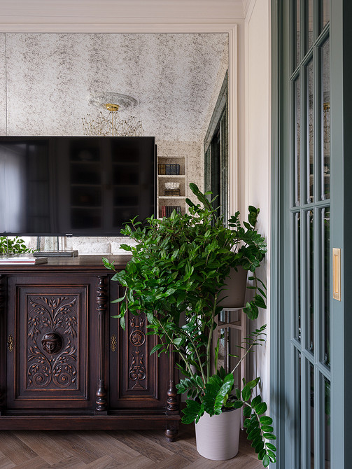 Зеркала — один из любимых дизайнерских приемов по украшению пустых стен. Причем дизайнеры выбирают не только обычные зеркала, но и разные декоративные версии: от винтажных до состаренных. В своей квартире дизайнер Светлана Тепфер использовала много зеркал, а в телевизионной зоне вся стена оформлена состаренными зеркалами в раме из молдингов. Они все еще визуально расширяют пространство, но за счет состаренной поверхности лучше вписываются в классический стиль и сочетаются с винтажным комодом под телевизором.