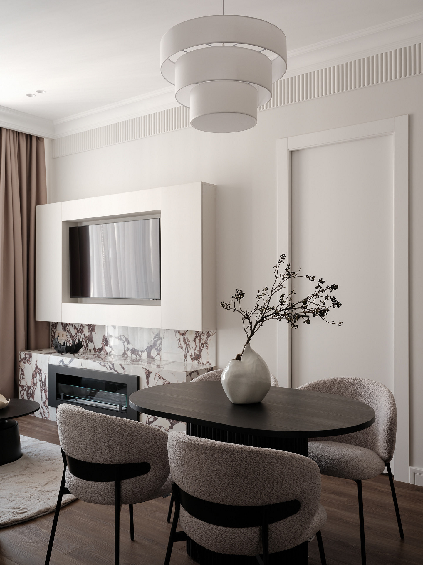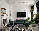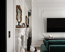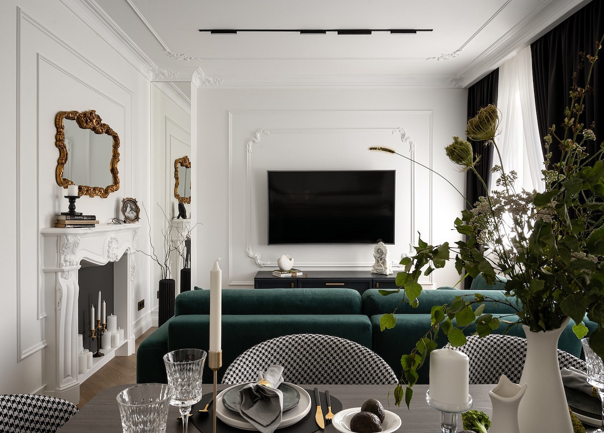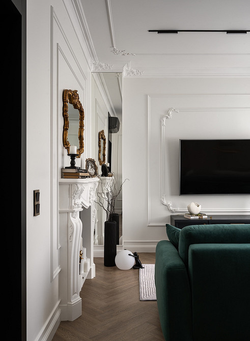 Настенные молдинги — один из самых популярных материалов в отделке сегодня. Их используют не только в интерьерах классических направлений, но и в современных стилях. В этой квартире по проекту Екатерины Козловой — классический интерьер. Квартира расположена в сталинке 1939 года в городе Могилев в Белоруссии. Екатерина оформляла новый интерьер для сдачи в краткосрочную аренду и выбрала современную классику с красивой лепниной, декоративным камином, зеркалами в резных рамах. Телевизор в гостиной оформлен в «рамы» из молдингов: из них выложили два прямоугольника — малый с красивыми лепными уголками и большой из прямых молдингов.