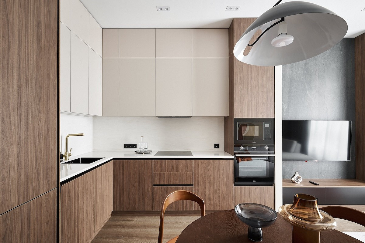 Плитку и керамогранит привычно видеть в отделке стен ванной комнаты или кухонного фартука, но сегодня дизайнеры расширяют возможности его применения. Так, например, в этой квартире по проекту Yuloo Studio крупноформатный керамогранит под черный камень уложен на стене за телевизором. На темном керамограните черный экран телевизора не выделяется. Мебель под дерево и темные фасады тумбы под телевизором отлично сочетаются с отделкой стены.