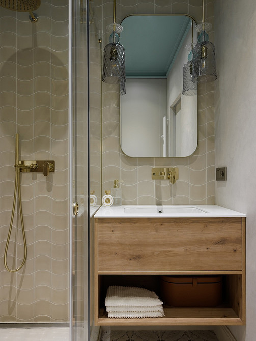 В ванной комнате использовали тот же керамогранит на полу. На стенах душевой и в зоне раковины уложили волнообразную плитку бежевого оттенка. Остальные стены покрыты декоративной штукатуркой. Стена с инсталляцией унитаза оформлена панелями под дерево.