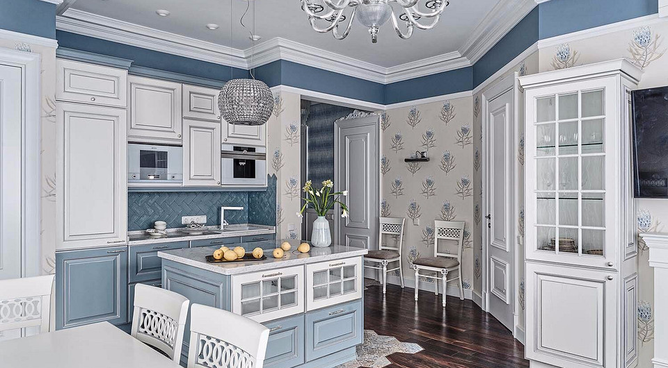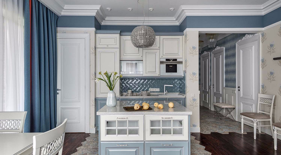 Традиционная планировка обыграна классическими элементами дизайна в духе прованса и лёгкой классики. Сочетание синего, серо-голубого и белого вносит в интерьеры ощущение наполненности лёгким воздухом летнего неба, водной глади и облаков.