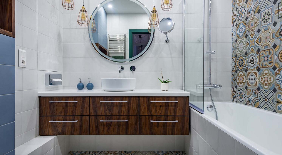 Ковры из плитки с богатым мелким орнаментом, расположенным нерегулярно, эффектно соседствуют с белой настенной плиткой и правильной геометрией сантехники.