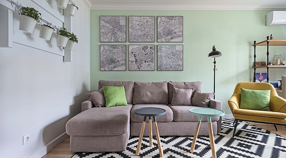 Насыщенный зелёный прихожей сменяют в ней нежно-оливковый тон стен и салатовые оттенки текстиля, жёсткие ахроматические ритмы есть в напольном ковре и мягко трансформируются в оттенки серого на шести картах европейских городов над диваном.