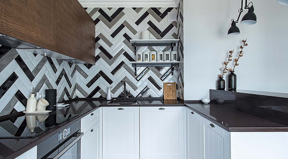 Например, очень интересно подана раскладка плитки. Так, в прихожей крупный волнообразный напольный узор задаёт поступательное движение, в кухне фартук, уложенный ёлочкой с нерегулярным сочетанием плашек в ахроматической гамме, напоминает экспрессивное абстрактное полотно, в санузлах ковровая раскладка в сочетании с мелкими узорами создаёт эффект богатых восточных ковров, устилающих пол и поднимающихся на стену. Соединение деталей брутального техно и индастриал, элементов поп-арта, экологических и этномотивов радует взгляд сменой картин.