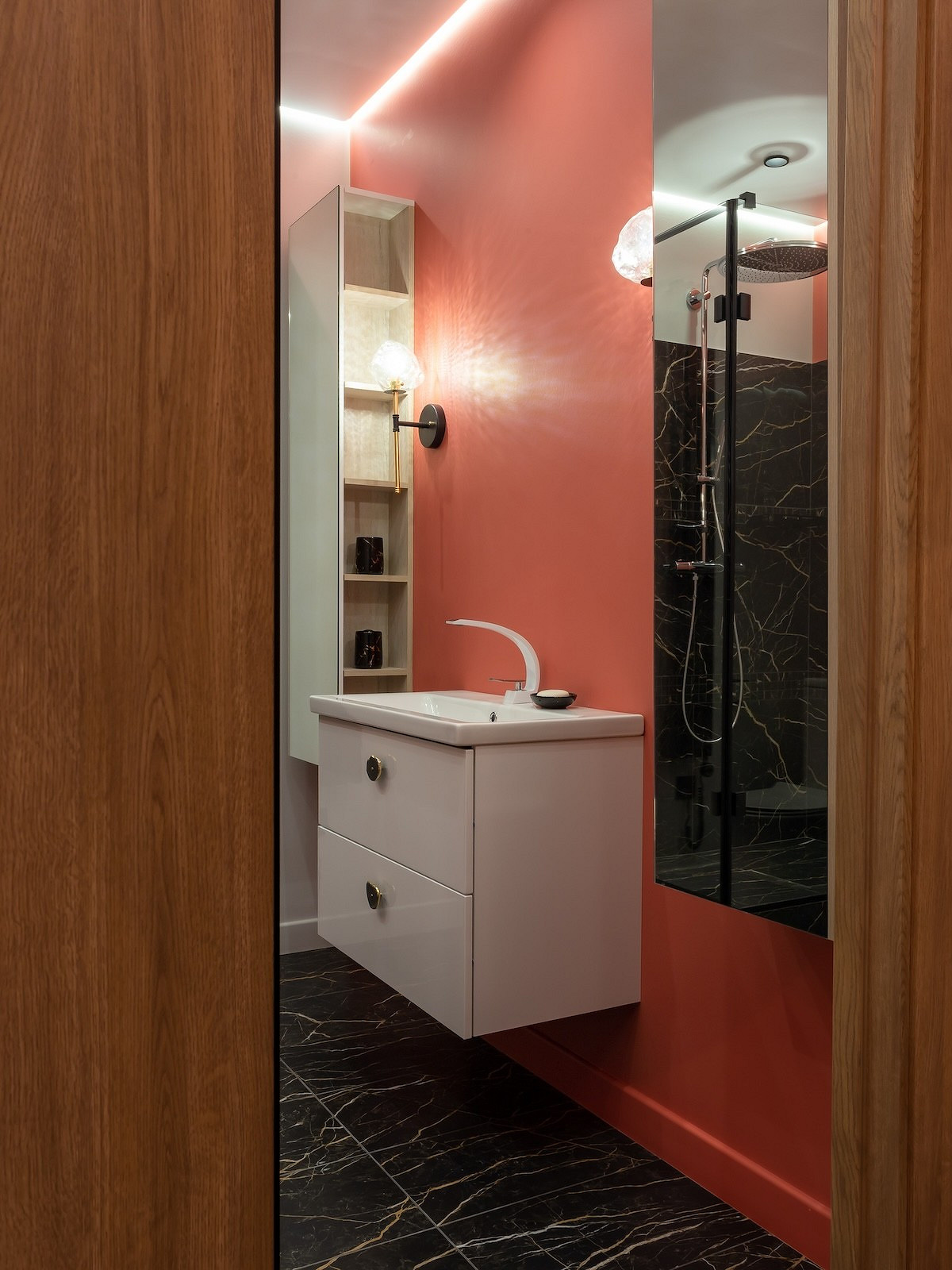 На полу в жилых комнатах и на кухне уложили ламинат. В прихожей и гардеробной использовали керамогранит под черный мрамор. В ванной комнате тот же керамогранит уложен на полу и в зоне душа, а остальные стены покрашены.