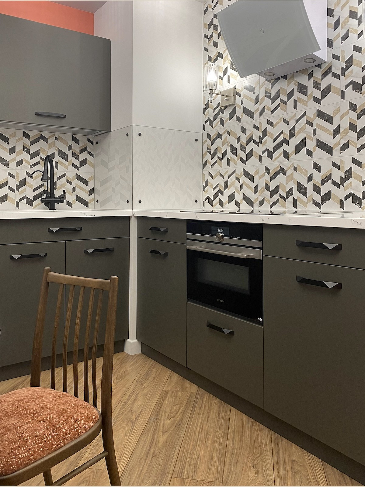 На кухне гарнитур разделен на три зоны. Слева от входа встроен шкаф с морозилкой, местом для кофемашины и чайника, а еще установлен холодильник.