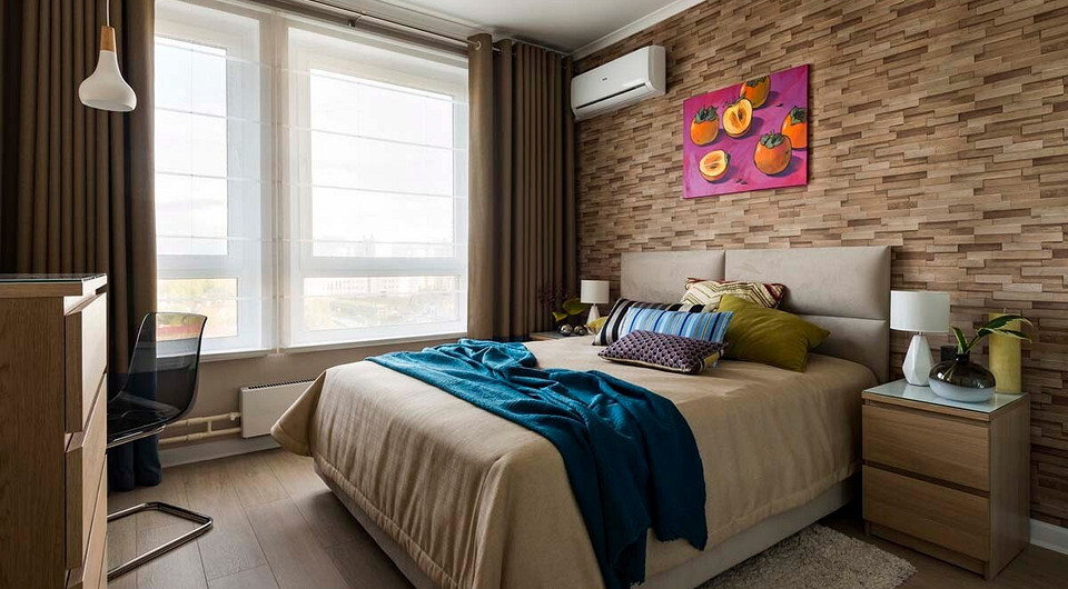 Преобразить спальню удалось с помощью 3D-обоев, имитирующих деревянную мозаику. Они создали на поверхности стены интересный эффект объёма и глубины. Цветовой доминантой выступают разные оттенки коричневого. В целом это актуальное, не устаревающее с годами оформление