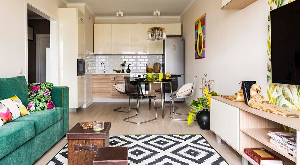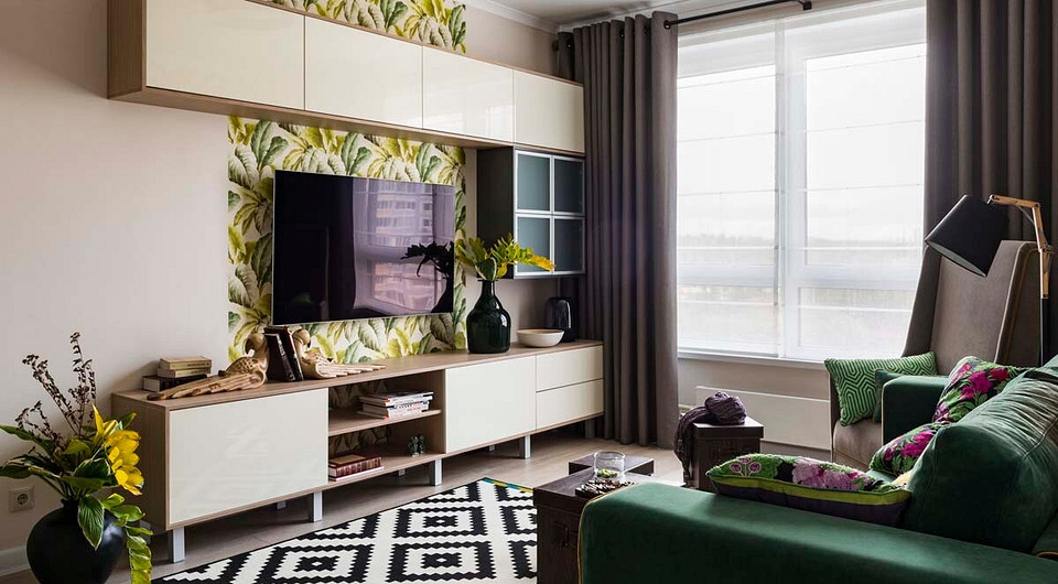 Предложенный вариант построен на современных мотивах, где доминируют простота и функциональность, отсутствуют вычурные детали. За основу взяты базовые цвета (белый, бежевый, песочный, коричневый). Но, по мнению дизайнера, интерьер для молодой пары не должен быть чересчур спокойным, поэтому появились яркие, поднимающие настроение краски. Ощущение радости и полноты жизни создают тропические принты на обоях и текстиле, обивка дивана изумрудного оттенка, а также эффектные авторские постеры с изображением спелых овощей, фруктов и цветов.