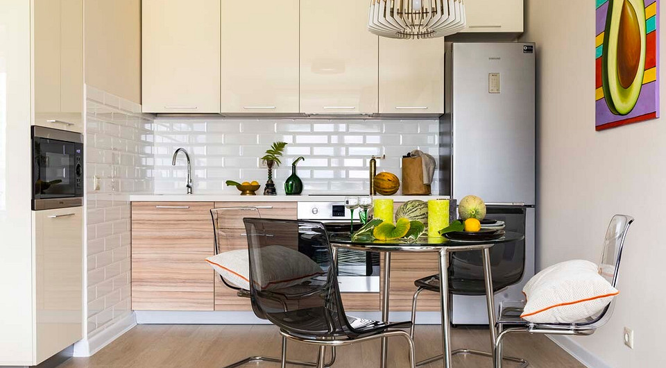 Чтобы сэкономить на отделке стен, вместо краски и декоративной штукатурки выбрали обои. На пол постелили ламинат, в прихожей — керамический гранит. В электропроводке ничего менять не стали — расположение розеток и выключателей оставили в соответствии с первоначальной схемой. Только в зоне кухни вывод под люстру перенесли таким образом, чтобы он находился над обеденным столом, в зоне приготовления еды добавили два потолочных спота.