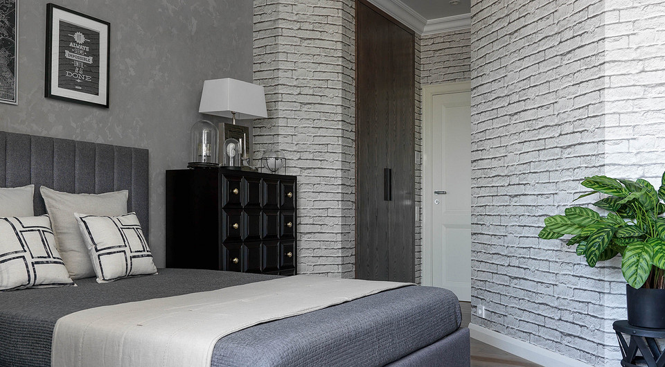 В детских продумали вместительные системы хранения. В комнате девочки выстроили ёмкий шкаф-домик (в его нише расположили спальное место). В комнате юноши предусмотрели рабочее место с системой хранения учебных материалов, шкаф и комод. Спальню родителей совместили с гардеробной. Ещё одну гардеробную организовали в прихожей.