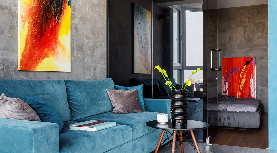 Квартира для молодого мужчины: холодный интерьер с бирюзовыми акцентами и панорамным видом из окон