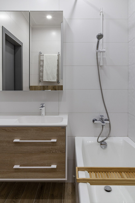 На полу уложен ламинат елочкой, исключая «мокрые» зоны — прихожую, небольшой участок рядом с кухонным гарнитуром, санузлы. В отделке санузлов на стенах использовали плитку.